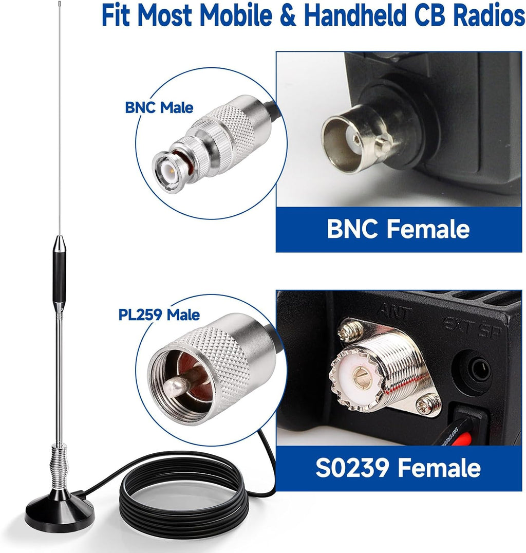 - Compatible with CB radios from many brand with a PL259 & BNC connector, improve quality and range to CB radio reception. The antenna works on all channel within CB radio frequency range of 26MHz to 27 MHz.