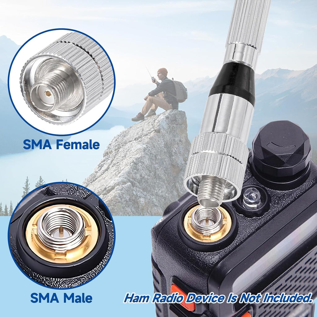 - Features: Frequency Band(136-174MHz[144MHz]/400-470MHz[430MHz]), Gain(3.5dBi), Length(6.29-15.15inches), Impedance(50 ohms), Power resistance(10W), Antenna connector(SMA Female), VSWR(less than 1.5), Material(Alloy), Direction of radiation(Omni-directional)