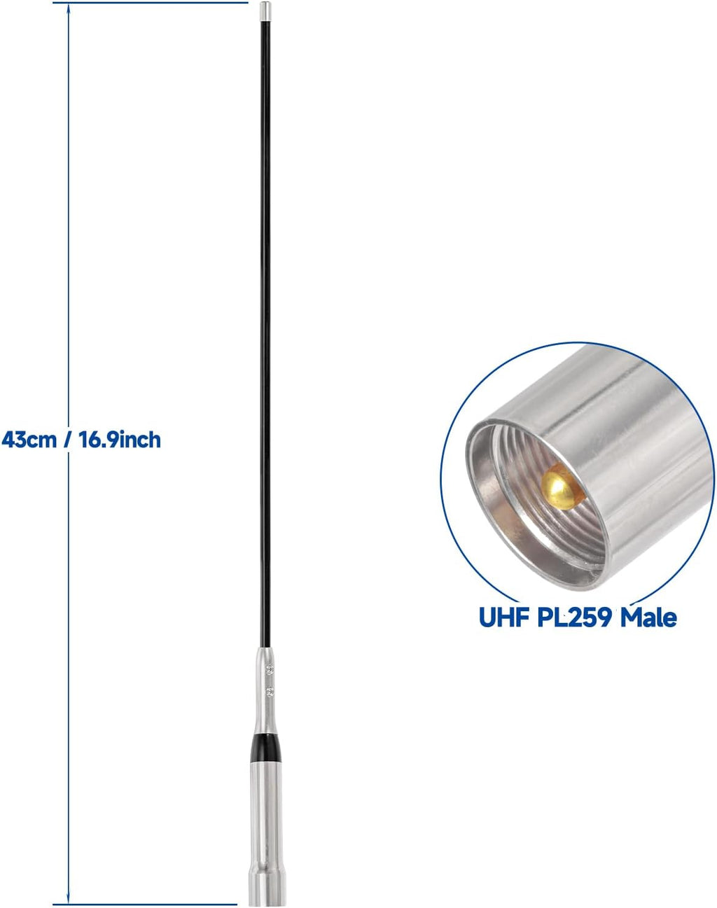 - Feature: Length(16.9inch), Impedance(50 ohms), Max Power(75W), Antenna connector(UHF Male), VSWR(less than 1.5), Waterproof(Rainning Proof), Direction of radiation(Omni-directional antenna)