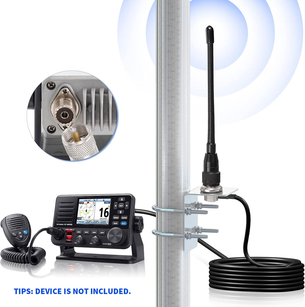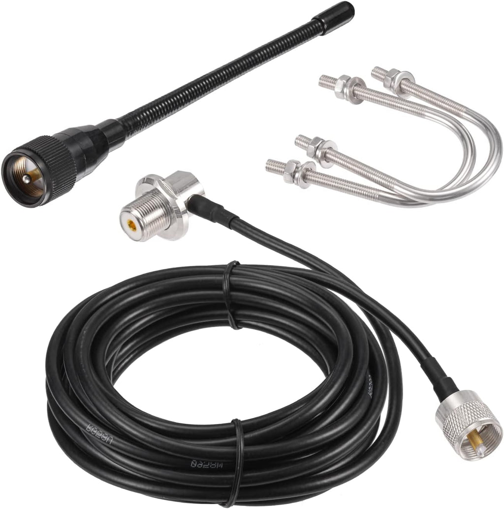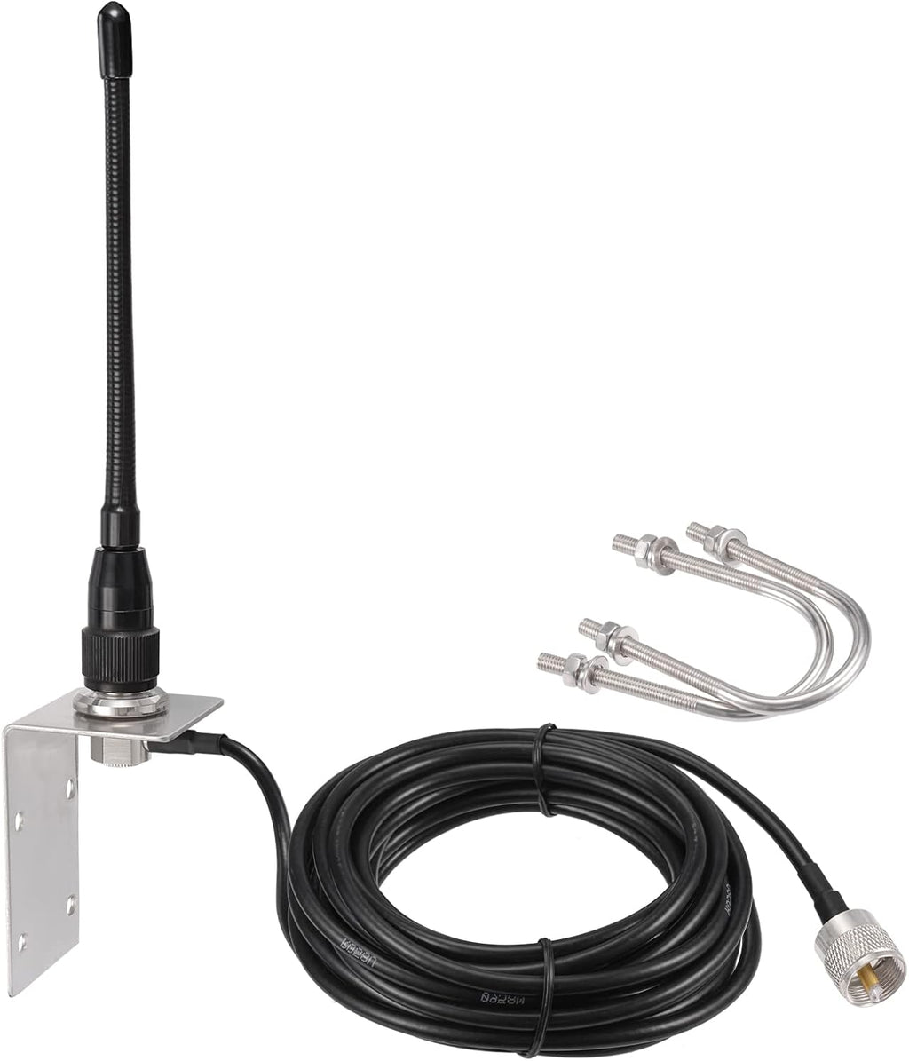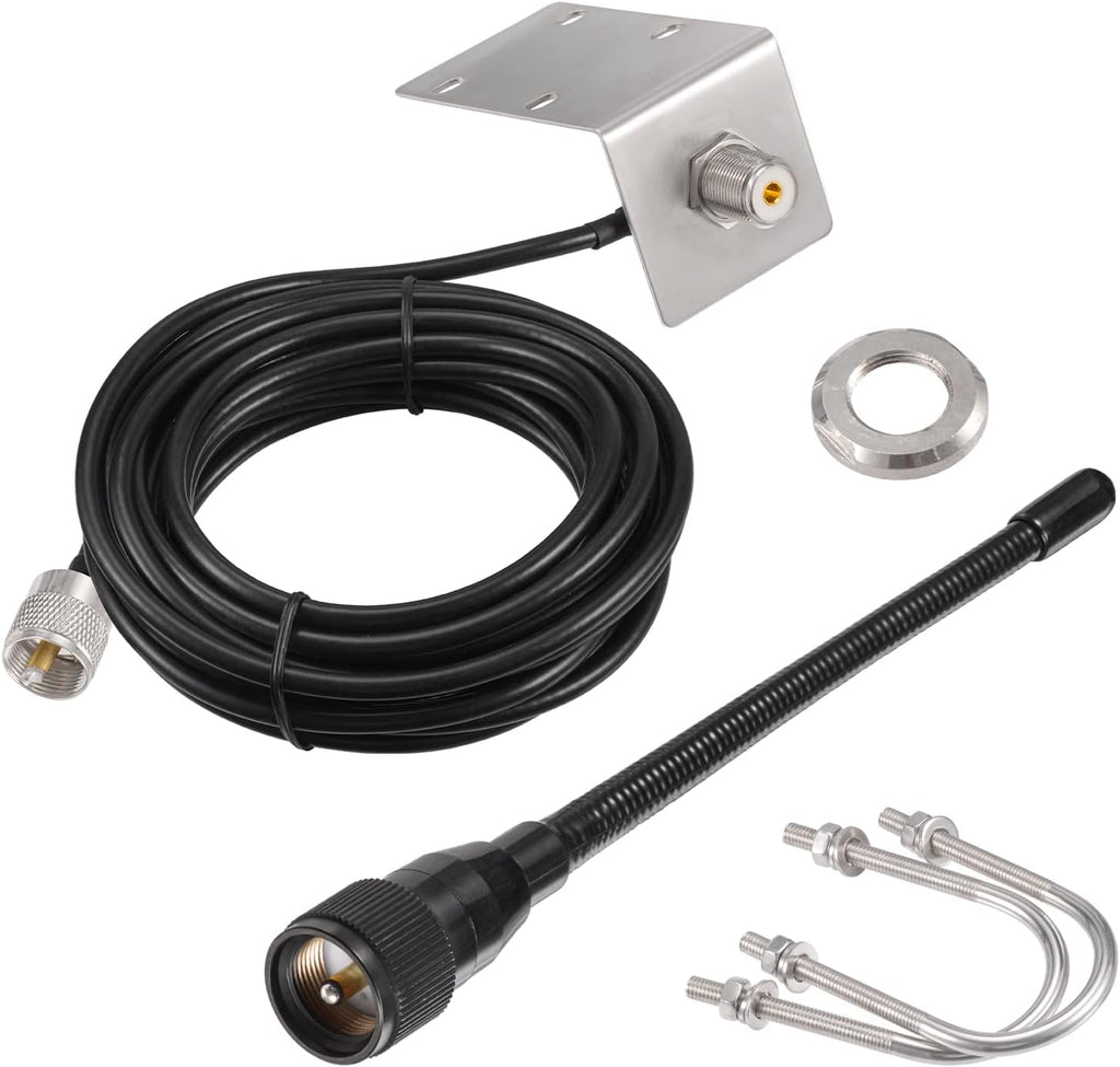- Feature: RG58 low loss coaxial cable, 16.5ft/5m cable length to extend the antenna mounting position; Stainless steel L-bracket and U-bolts, easy to install;
