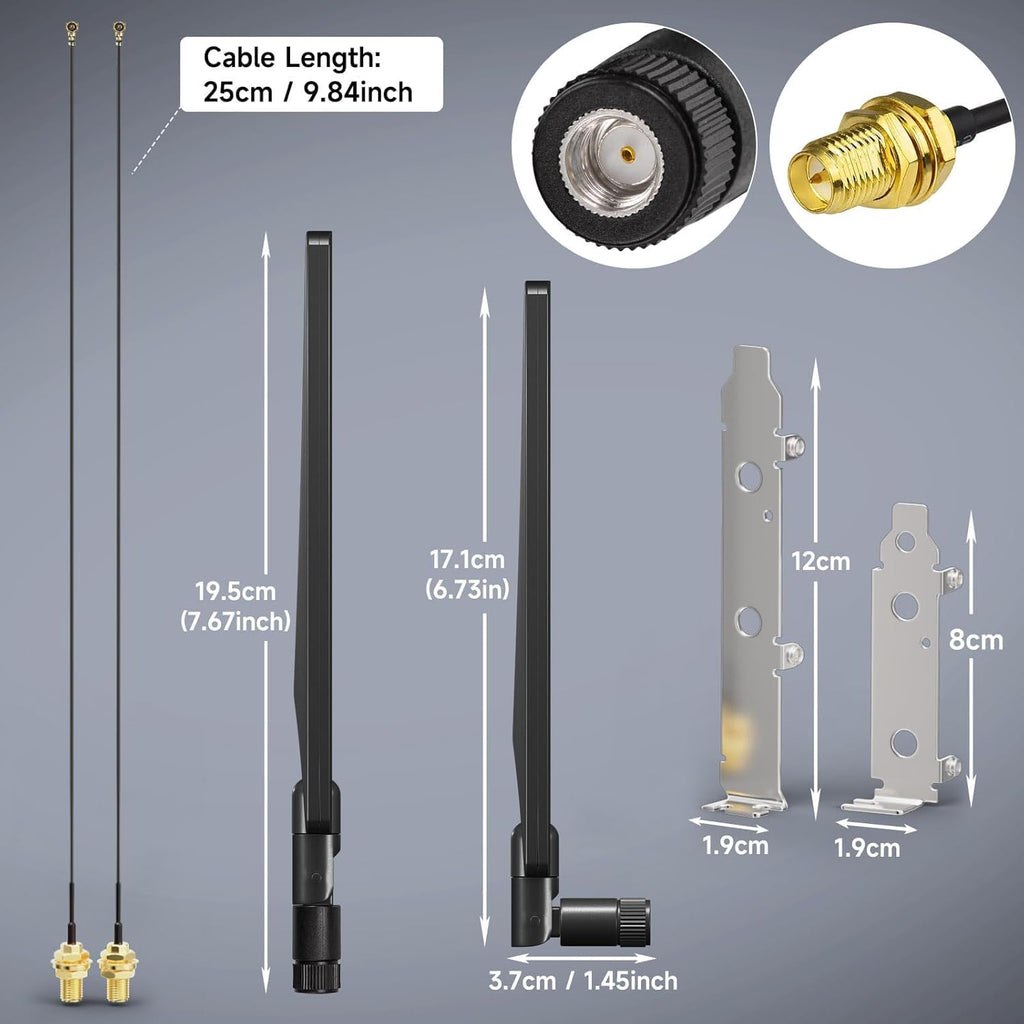 - Package List: 2 x WiFi 6 Antennas, 2 x Coaxial Pigtail Cables, 2 x PCI Slot Brackets