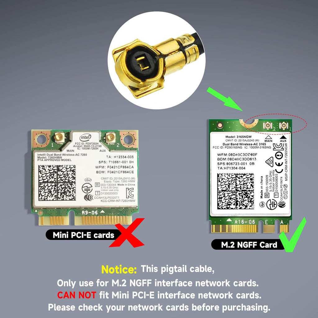 - Note: This pigtail cable only use for M.2 NGFF interface network cards, can not fit Mini PCI-E interface network cards, please check your network cards before purchasing.