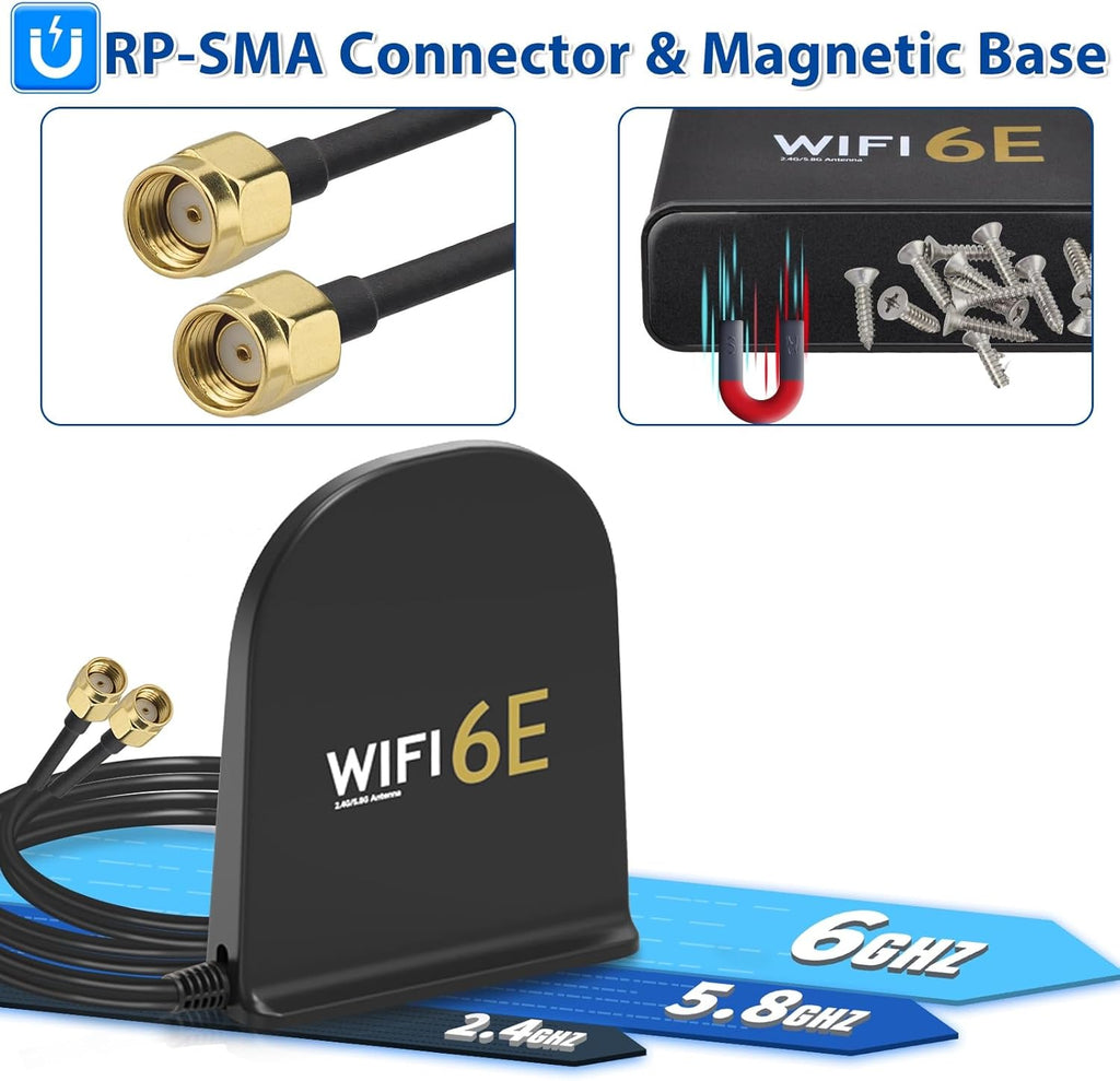 - Tri-Band WiFi: 2.4g(2400-2500MHz)/5g(5150-5850MHz)/6g(5900-7125MHz); Support 802.11 b/g/n/ac/ax/wifi 6/wifi 6e; Gain: 8dBi; Direction: Omni-directional; Antenna Connector: RP-SMA Male Connector